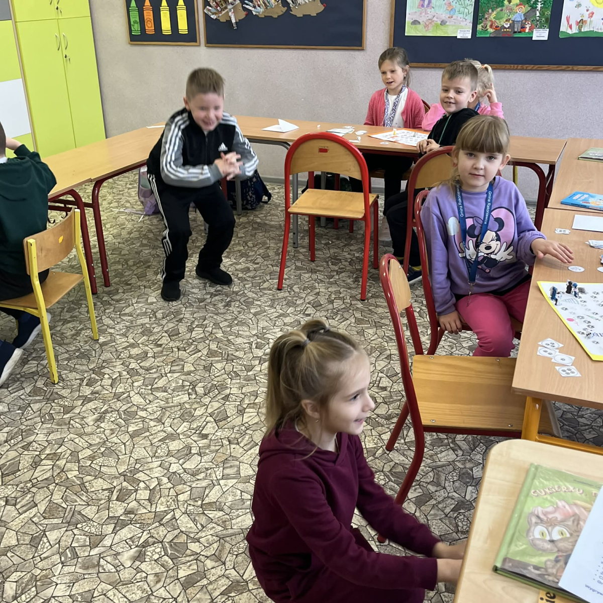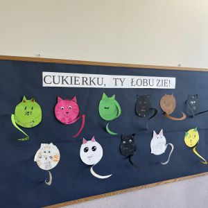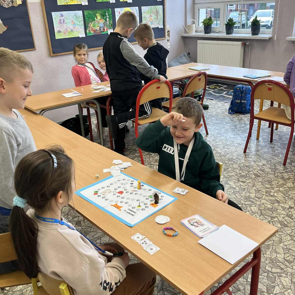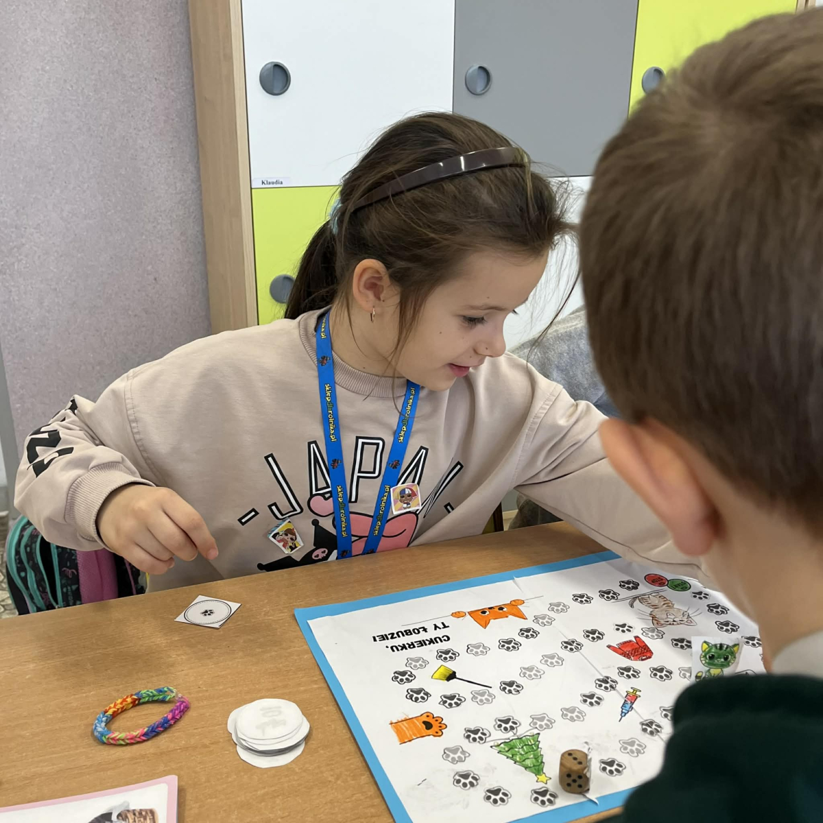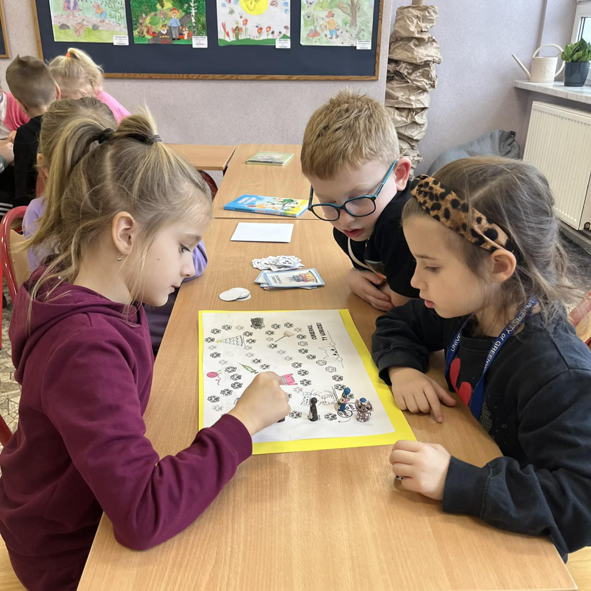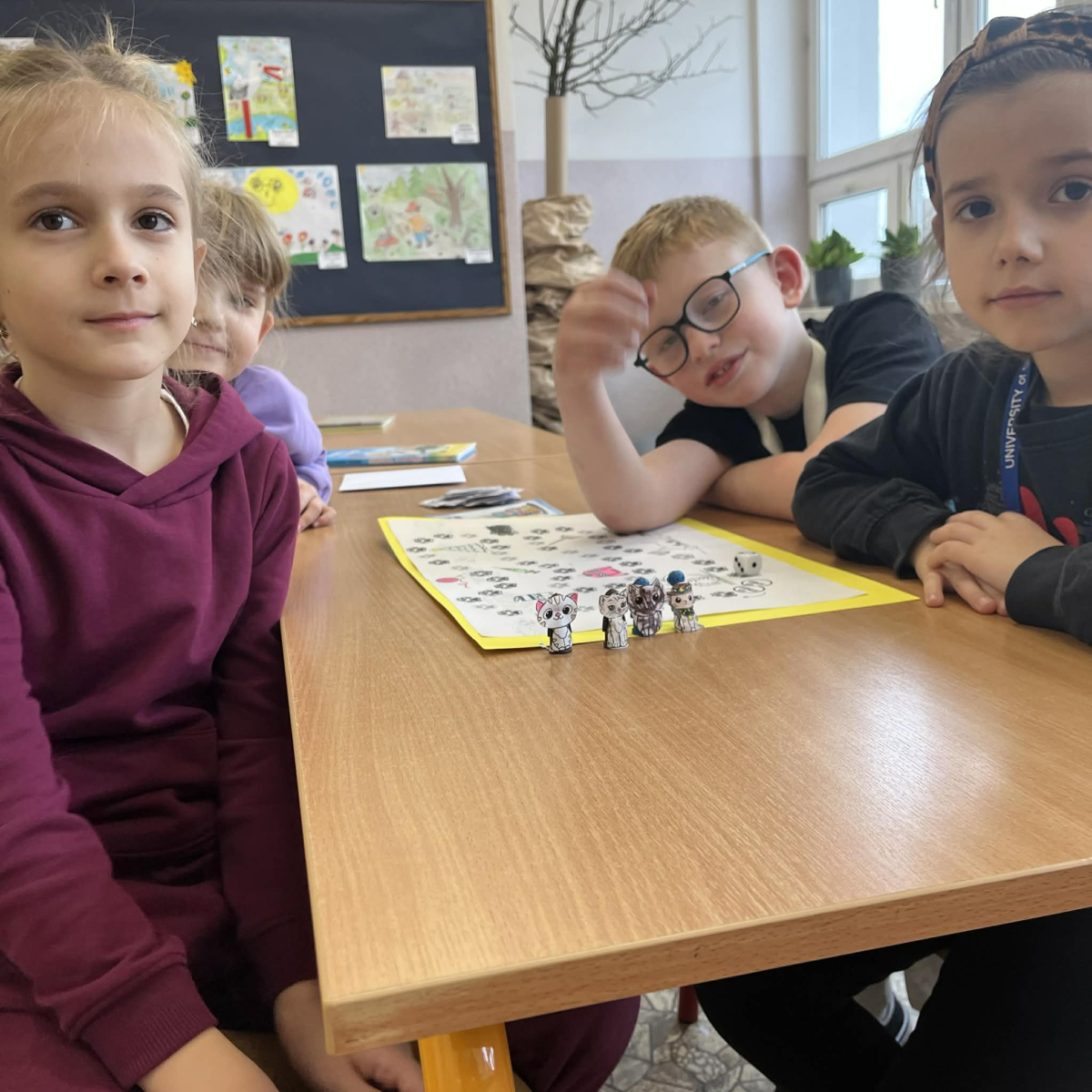 Podczas omawiania lektury „Cukierku, ty łobuzie” uczniowie klasy pierwszej przygotowali grę planszową, która pomogła im utrwalić treść książki i lepiej poznać przygody niesfornego kota Cukierka.