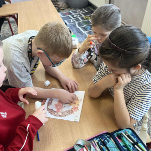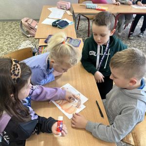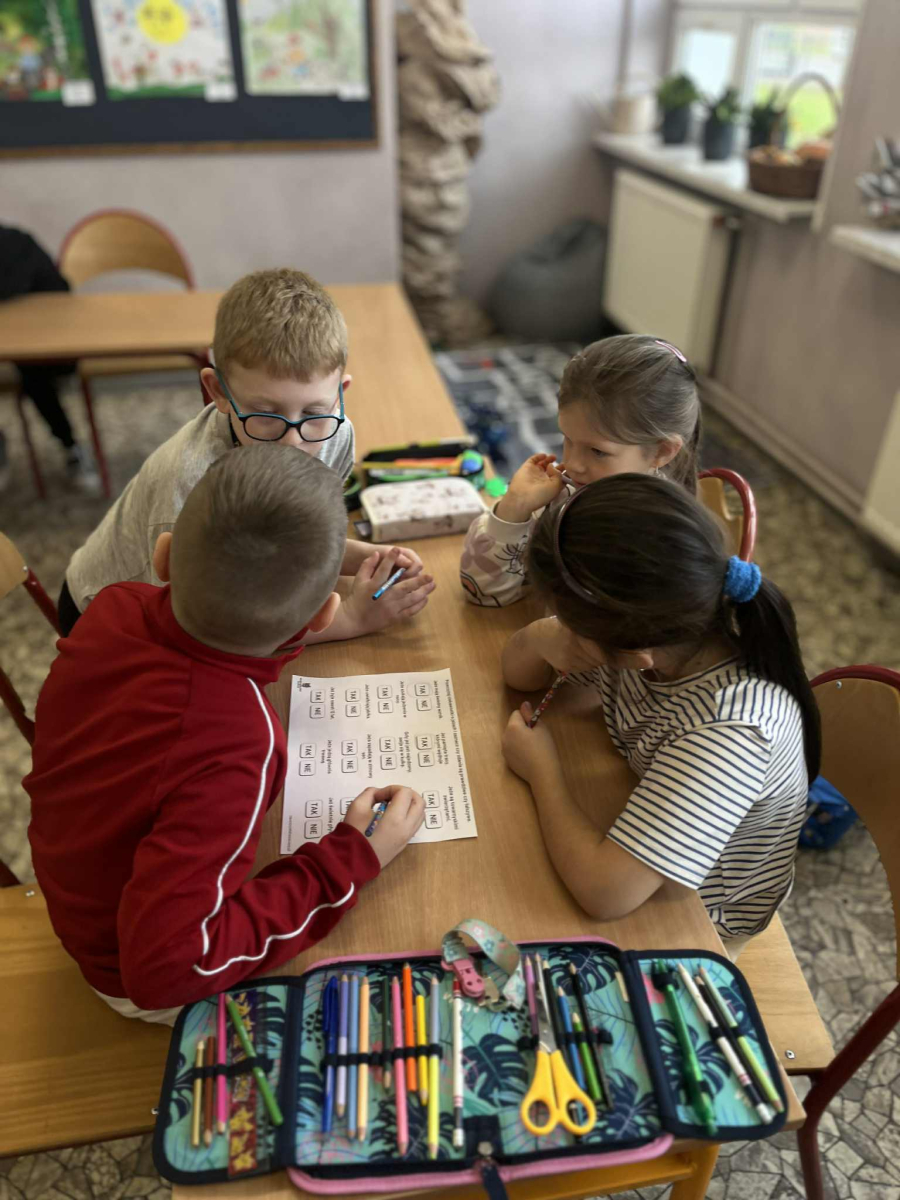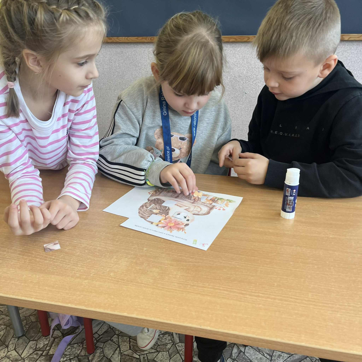 Na początku zajęć poznaliśmy wiele ciekawostek o jeżach – dowiedzieliśmy się, gdzie mieszkają, czym się żywią i jak przygotowują się do zimy. Następnie pracowaliśmy w grupach, odpowiadając na pytania dotyczące tych zwierząt oraz układając z rozsypanki obrazek przedstawiający jeża.