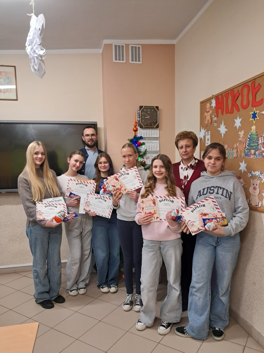Dnia 4 XII 2025 r. w sali komputerowej odbył się religijny szkolny konkurs wiedzy o św. Mikołaju. Uczniowie klas I-VIII zmierzyli się z wiedzą z zakresu: życiorysu prawdziwego św. Mikołaja (św. Mikołaj z Mirry), tradycji oraz współczesnych wyobrażeniom mikołajkowych.