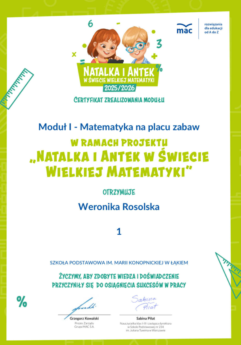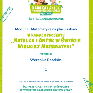 Uczniowie klasy I rozpoczęli przygodę z ogólnopolskim projektem edukacyjnym „Natalka i Antek w świecie wielkiej matematyki”. Celem projektu jest pokazanie dzieciom, że matematyka to nie tylko liczby i działania w zeszycie, ale również fascynująca część codziennego życia.