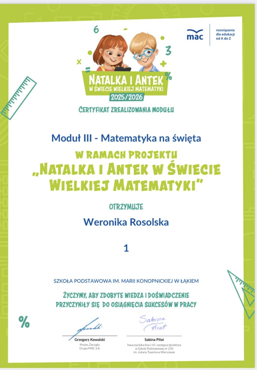 Dzięki realizacji modułu uczniowie budowali pozytywne skojarzenia z naukami ścisłymi oraz poznawali podstawy zarządzania finansami, z którymi warto zaznajamiać się już od najmłodszych lat. Efektem końcowym działań było przygotowanie listy zakupów zgodnie z zaplanowanym budżetem, co stanowiło podsumowanie zdobytej wiedzy i umiejętności.