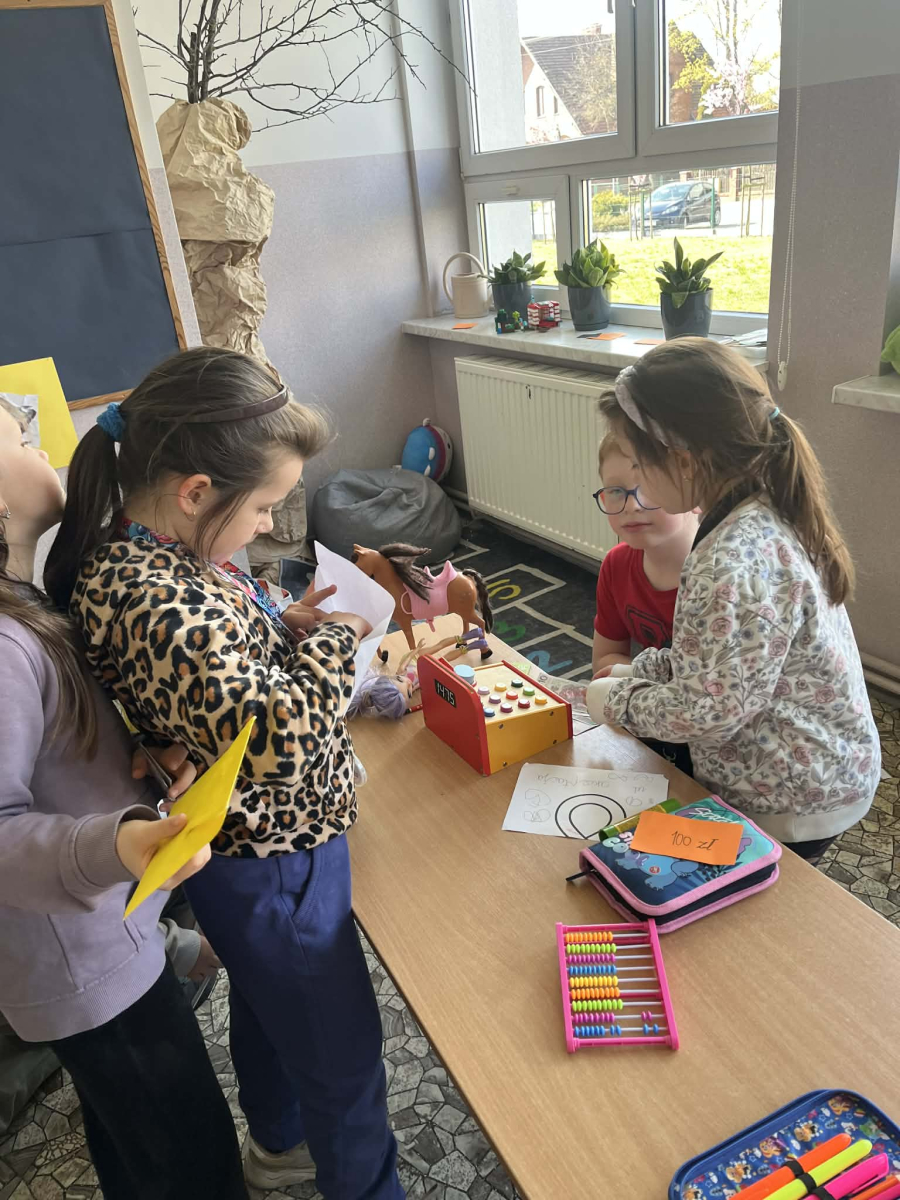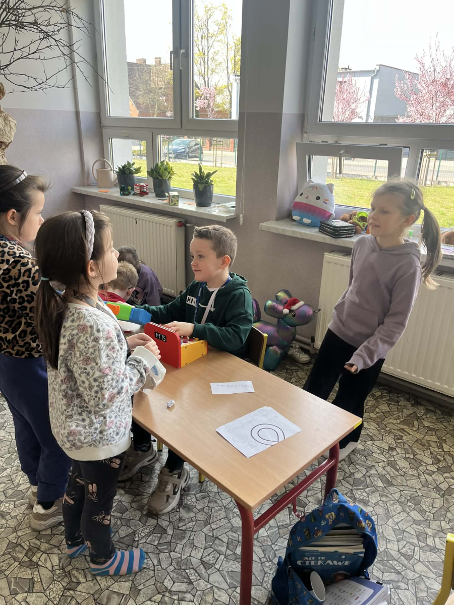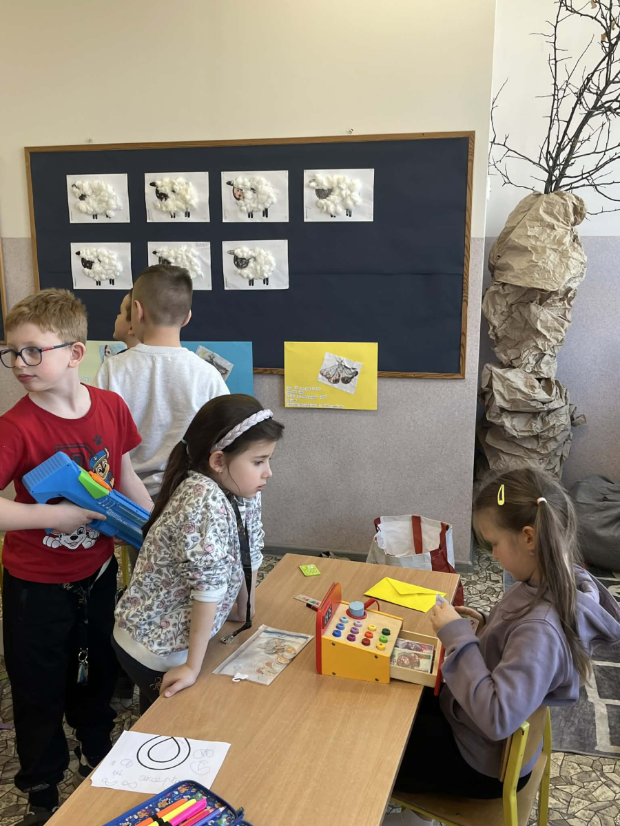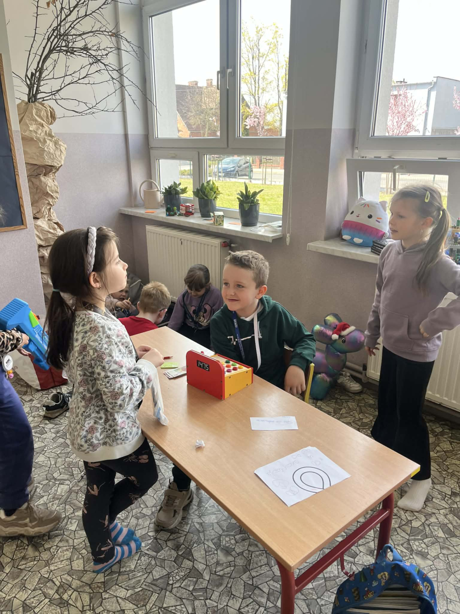 Podczas zajęć sala lekcyjna zamieniła się w mały sklep. Dzieci wcielały się w role sprzedawców i klientów, ucząc się rozpoznawania nominałów monet i banknotów oraz przeliczania odpowiednich kwot. Uczniowie z dużym zaangażowaniem dokonywali zakupów, wydawali resztę i podejmowali decyzje dotyczące wyboru produktów.