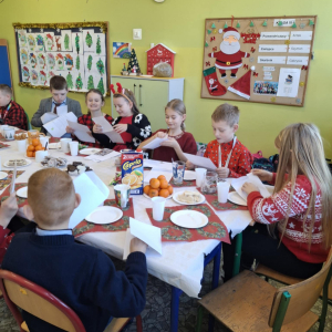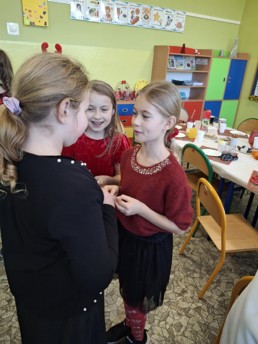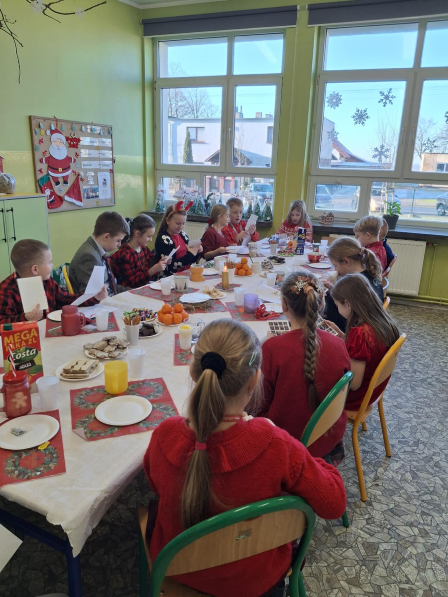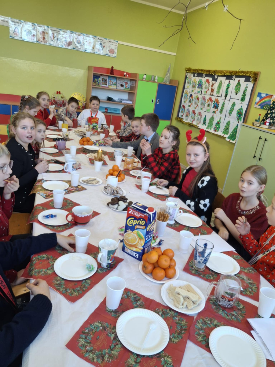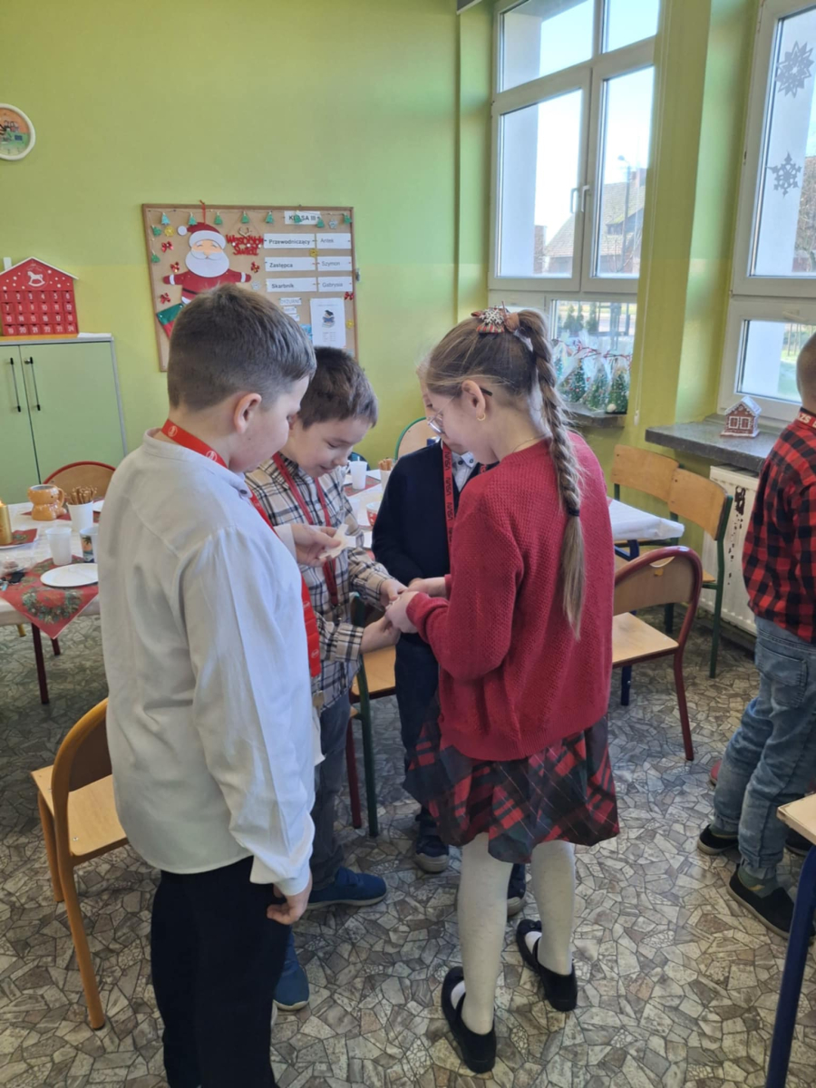 19 grudnia w klasie 3 odbyła się wyjątkowa, pełna ciepła wigilia klasowa. Uczniowie wspólnie dzielili się opłatkiem, składając sobie serdeczne życzenia świąteczne. Dzieci z radością otrzymały świąteczne prezenty, które wywołały wiele uśmiechów.