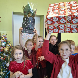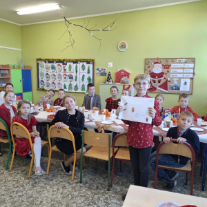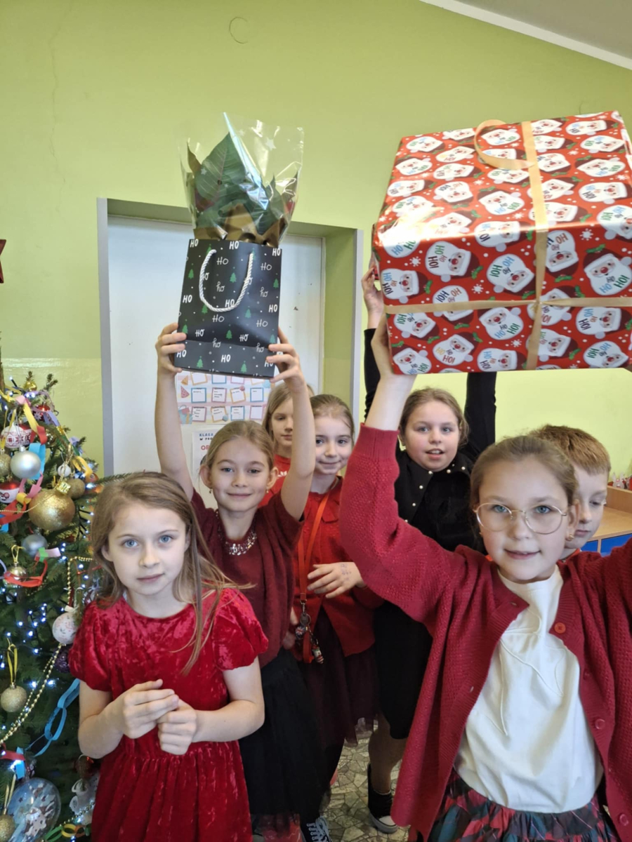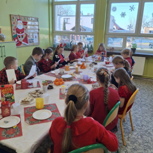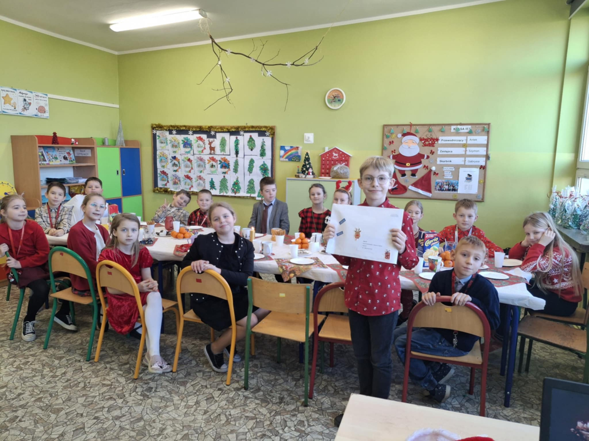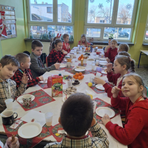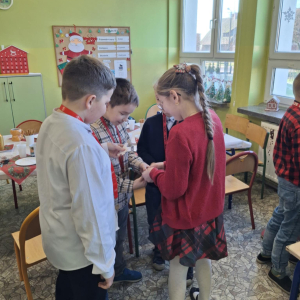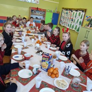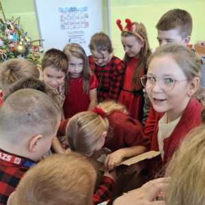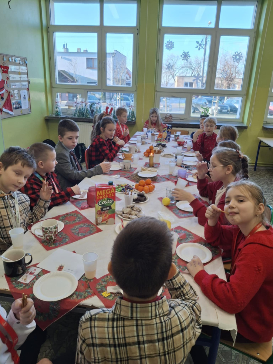 19 grudnia w klasie 3 odbyła się wyjątkowa, pełna ciepła wigilia klasowa. Uczniowie wspólnie dzielili się opłatkiem, składając sobie serdeczne życzenia świąteczne. Dzieci z radością otrzymały świąteczne prezenty, które wywołały wiele uśmiechów.