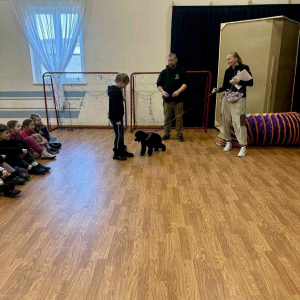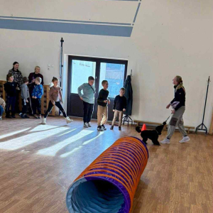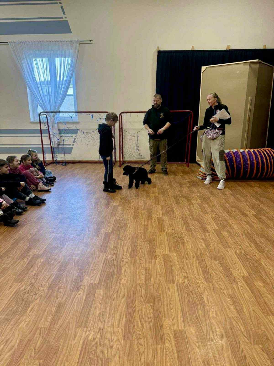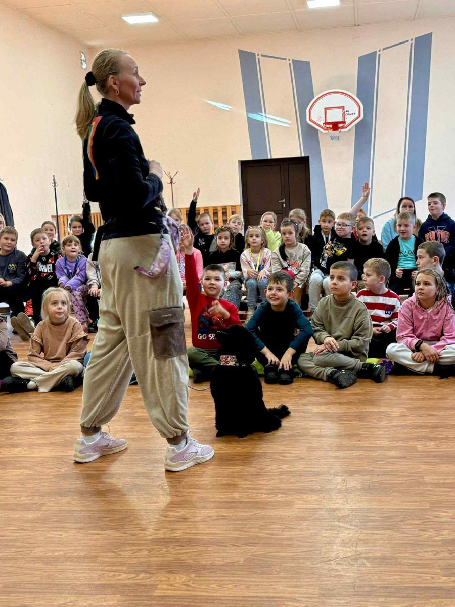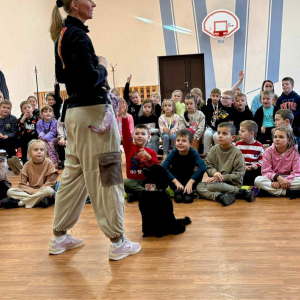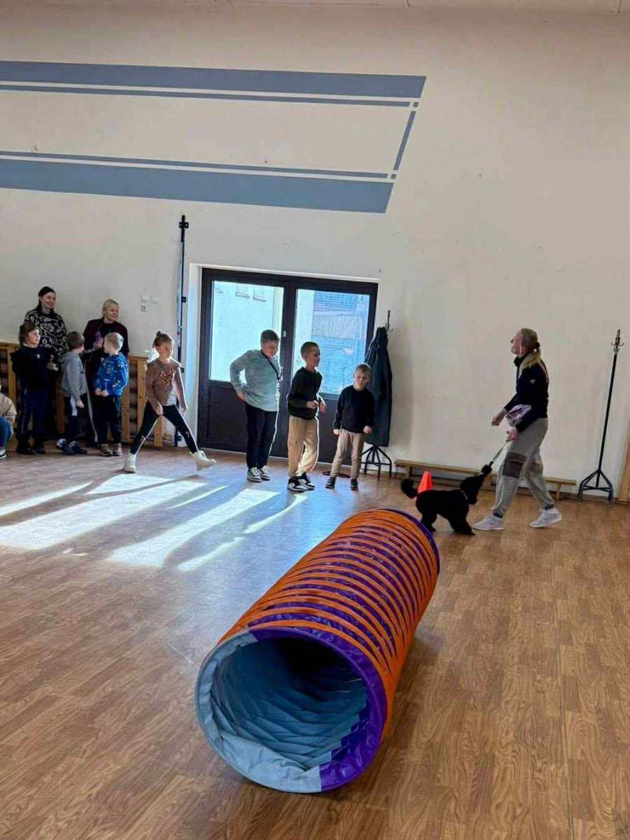 Podczas spotkania uczniowie mieli okazję dowiedzieć się, na czym polega dogoterapia, jak należy postępować z psami oraz w jaki sposób zwierzęta mogą pomagać ludziom – zarówno w nauce, jak i w codziennym życiu. Dzieci uczyły się także, jak zachować się w sytuacji spotkania z nieznanym lub groźnym psem – ćwiczyły m.in. „pozycję żółwia”, która pomaga chronić się w razie zagrożenia. Największą atrakcją była możliwość pogłaskania trzech wspaniałych psów, które towarzyszyły prowadzącym. Czworonożni goście zaprezentowali również swój tor przeszkód, pokazując, jak dobrze potrafią współpracować z człowiekiem. To było wyjątkowe spotkanie pełne uśmiechu, wiedzy i pozytywnych emocji! Dziękujemy Akademii Pana Bobra za odwiedziny i wspaniałą lekcję przyjaźni między człowiekiem a psem!