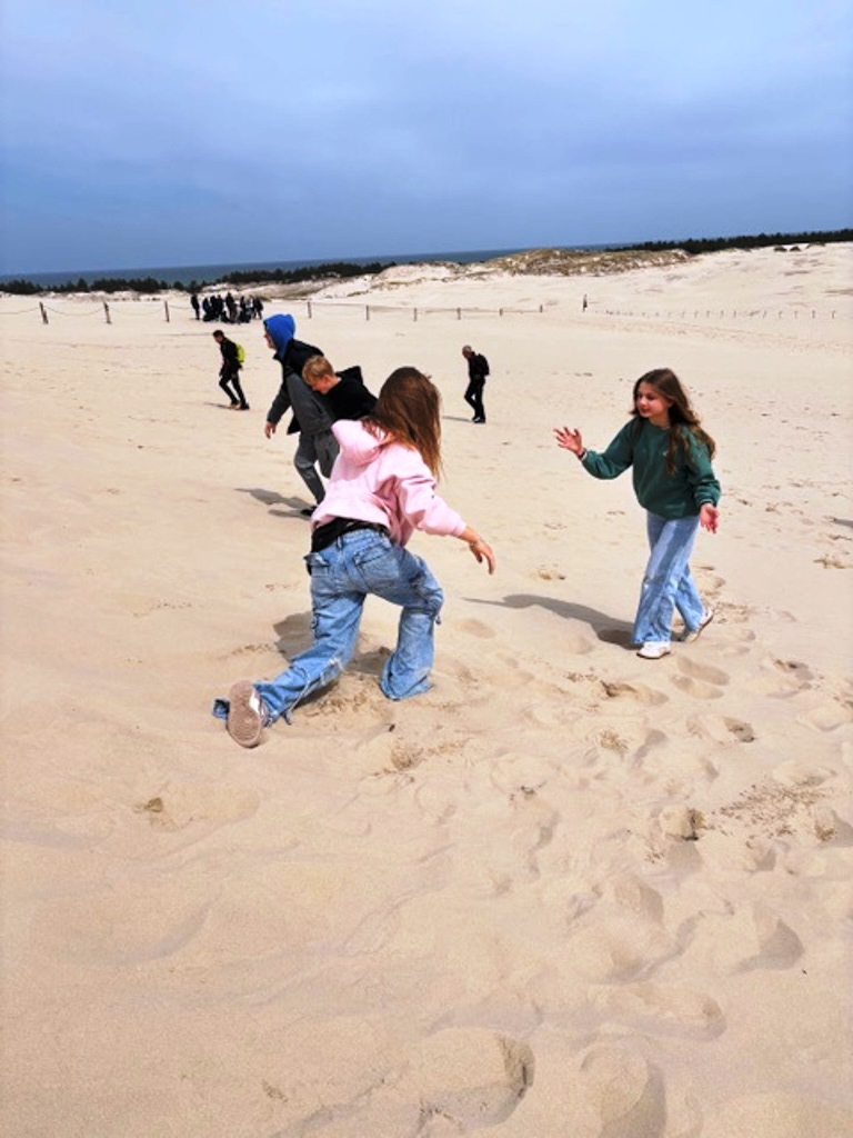 Drugi dzień rozpoczął się od wyprawy na ruchome wydmy w Słowińskim Parku Narodowym – jedno z najbardziej niezwykłych miejsc w Polsce. Spacer po „polskiej Saharze” pozwolił uczniom poczuć klimat prawdziwej pustyni. Po aktywnym przedpołudniu przyszedł czas na relaks w centrum Łeby – uczniowie chętnie zajadali się goframi, kupowali pamiątki i cieszyli się atmosferą nadmorskiego miasteczka.