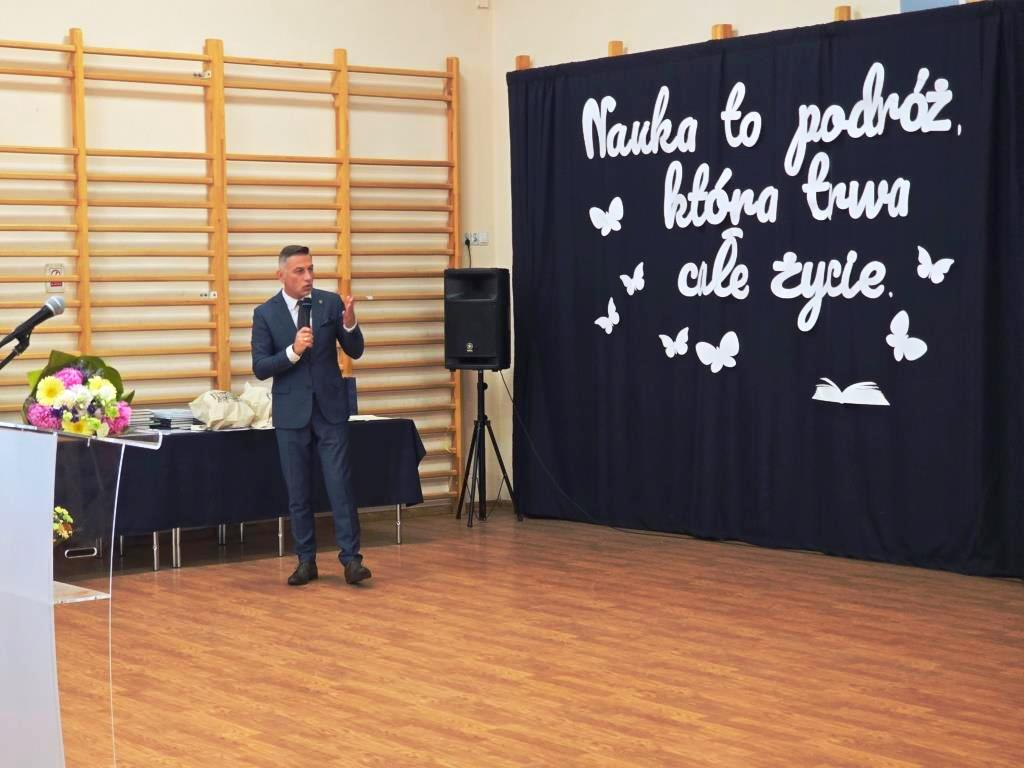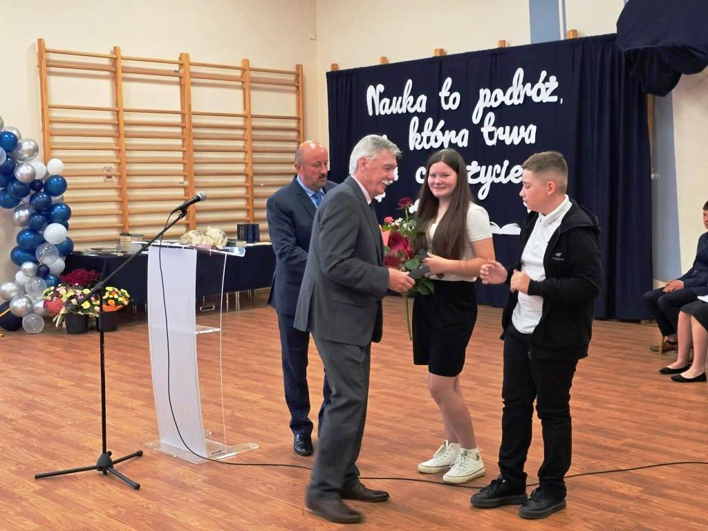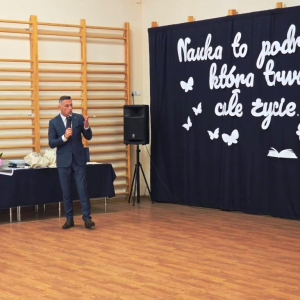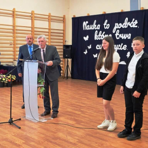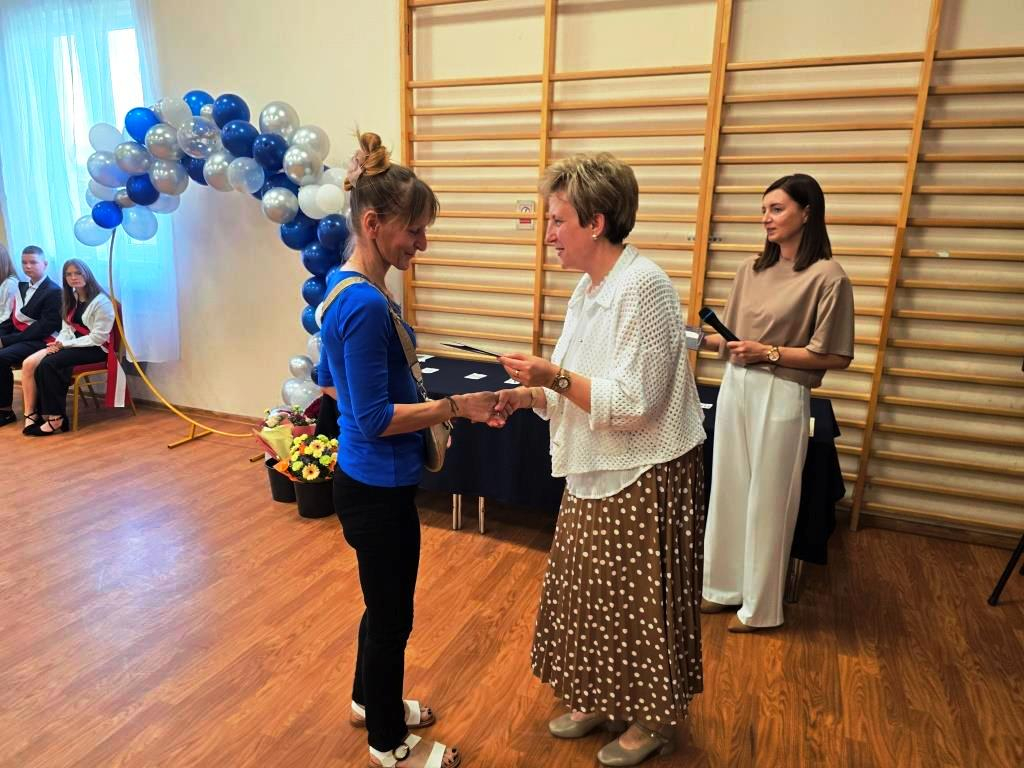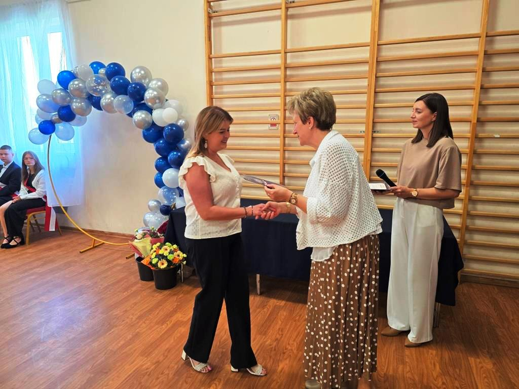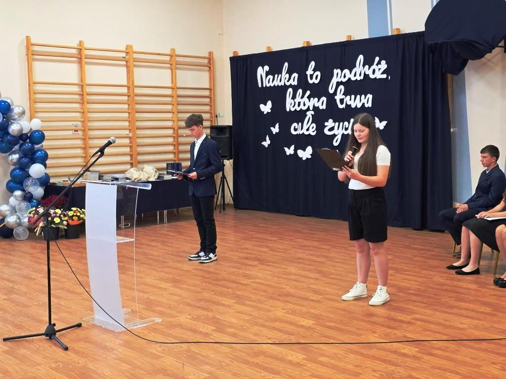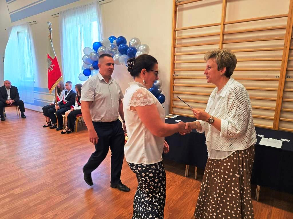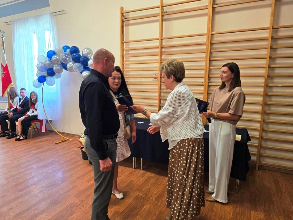 Podczas akademii głos zabrali zaproszeni goście oraz Pani Dyrektor, wyrażając wdzięczność za miniony rok wspólnej pracy i nauki. Wręczono podziękowania dla rodziców uczniów klasy VIII i przyjaciół szkoły za ich nieocenione wsparcie i zaangażowanie w życie placówki.