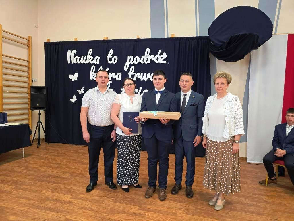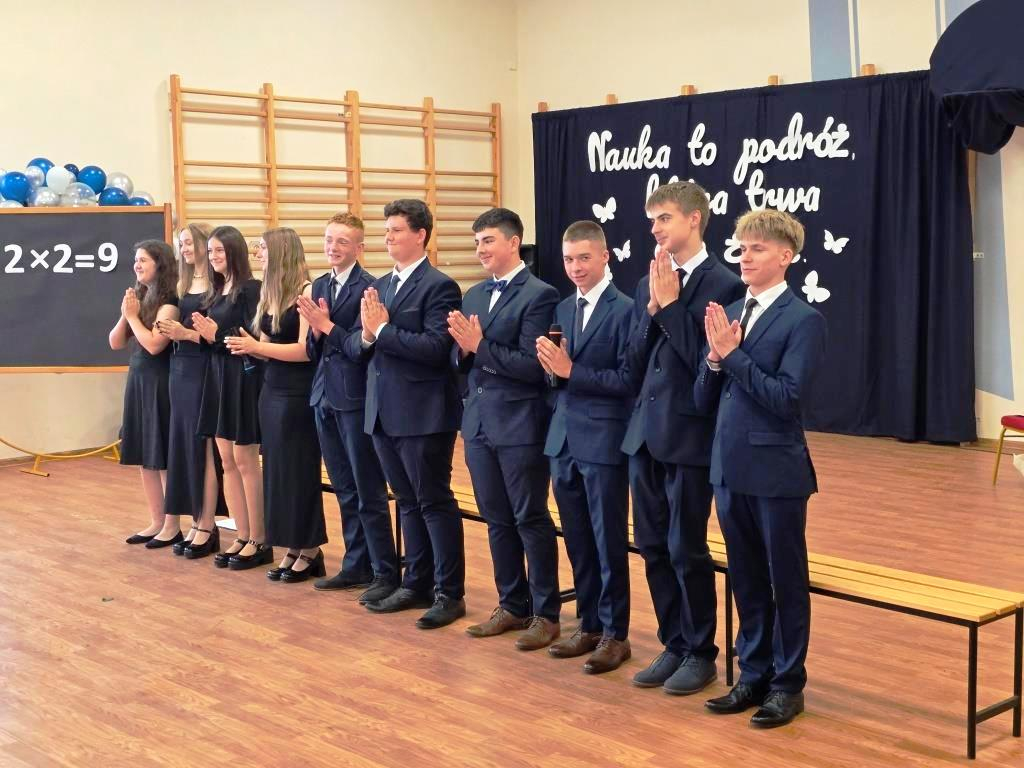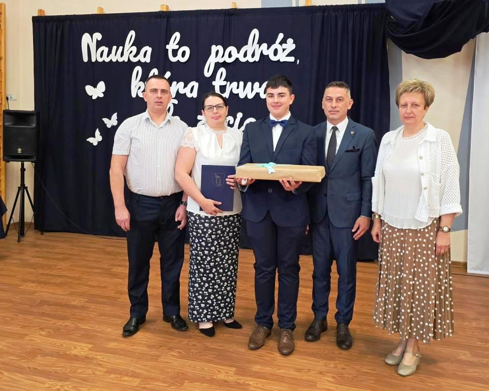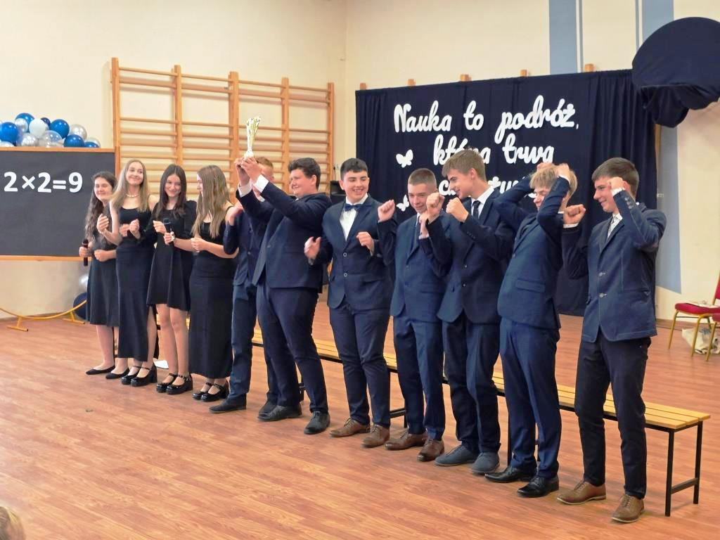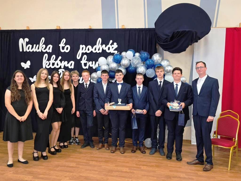 Tego dnia pożegnaliśmy także uczniów klasy VIII. Jedenastu z nich zakończyło swoją edukację w naszej szkole, stając się absolwentami Szkoły Podstawowej im. Marii Konopnickiej w Łąkiem. Tytuł Absolwenta Roku otrzymał Oskar Hulalka – serdeczne gratulacje!